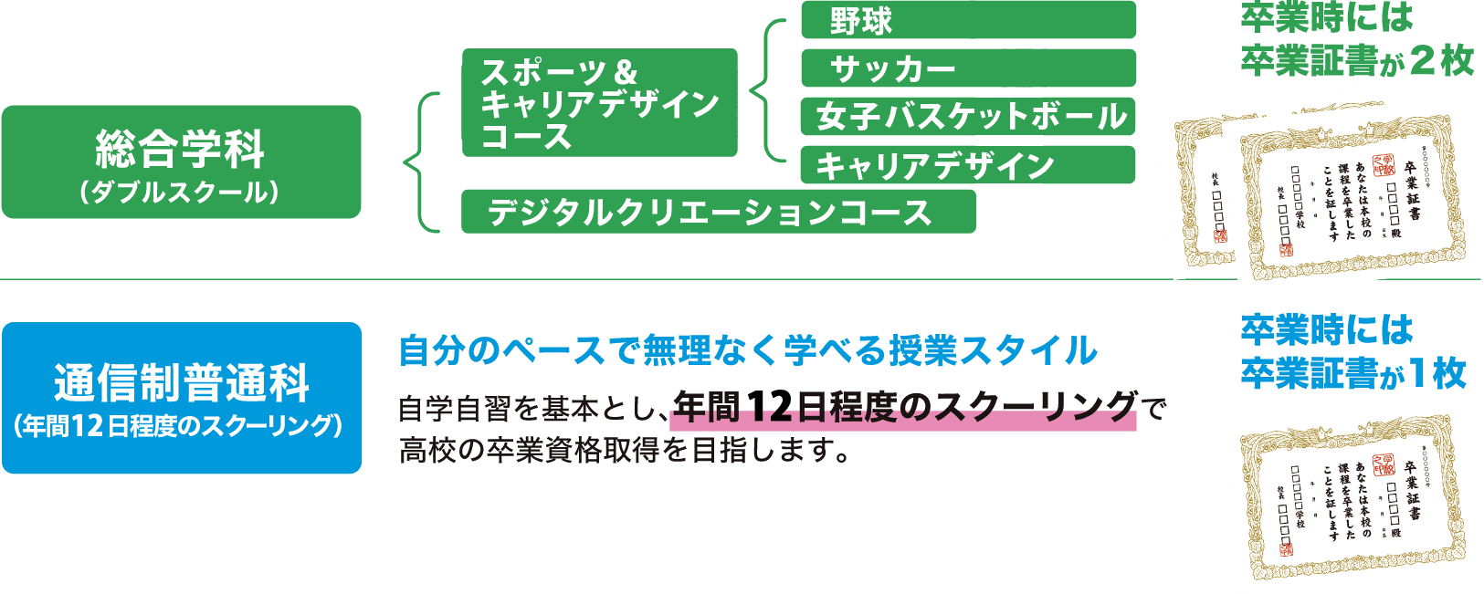 総合学科では、未来高等学校の普通教育に関する科目とKBC高等学院の専門教育に関する科目の両方を学びます。総合学科の特色であるキャリアガイダンスの授業を通して「将来は何をやりたいのか」「どんな生き方をしたいのか」自分を見つめ、自分に合った進路を考え、コース別学習では、専門性を深め、個性を伸ばしていくことができます。プレゼンテーション能力を高めるため、どの授業でもコミュニケーションを重視し、自ら学ぶ力と豊かな人間性を育んでいきます。
